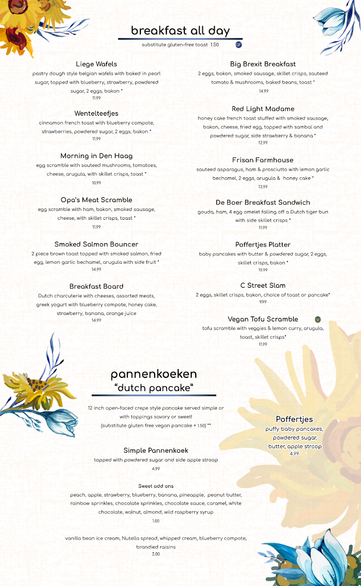 Welcome to Van Gogh's Eeterie, a delightful gem located at 334 E Commercial St in Springfield, MO, where Dutch cuisine takes center stage. The menu offers an array of dishes that celebrate traditional flavors with a modern twist. Breakfast is a standout, with customer favorites like Dutch pancakes that come with a variety of sweet and savory toppings, and a flavorful tofu scramble boasting a light curry infusion.